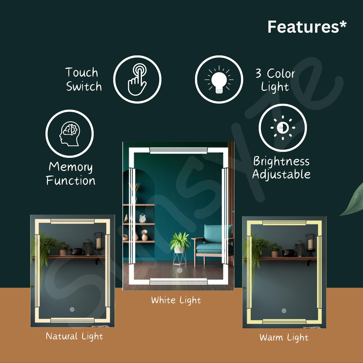 Enhance your bathroom experience with our stunning 18×24 inch LED mirrors, a perfect fusion of functionality and style. This bathroom LED mirror not only serves its practical purpose but also adds a touch of modern elegance to your space. Brighten up your daily beauty routine with integrated LED lights that provide bright, natural light for a flawless reflection. Crafted with precision, this mirror with light features a sleek and contemporary design, making it a focal point in any bathroom. The 18×24-inch size is ideal for smaller to medium-sized spaces, offering the perfect balance between form and function. Energy-efficient LED lights not only increase visibility but also create a warm and inviting ambiance in your bathroom. Designed for easy installation, this LED mirror is a hassle-free addition to your home. The high-quality materials ensure durability. 3 Colour Light Mirror (White, Warm & Natural) Touch sensor controlled with Brightness Adjustable.