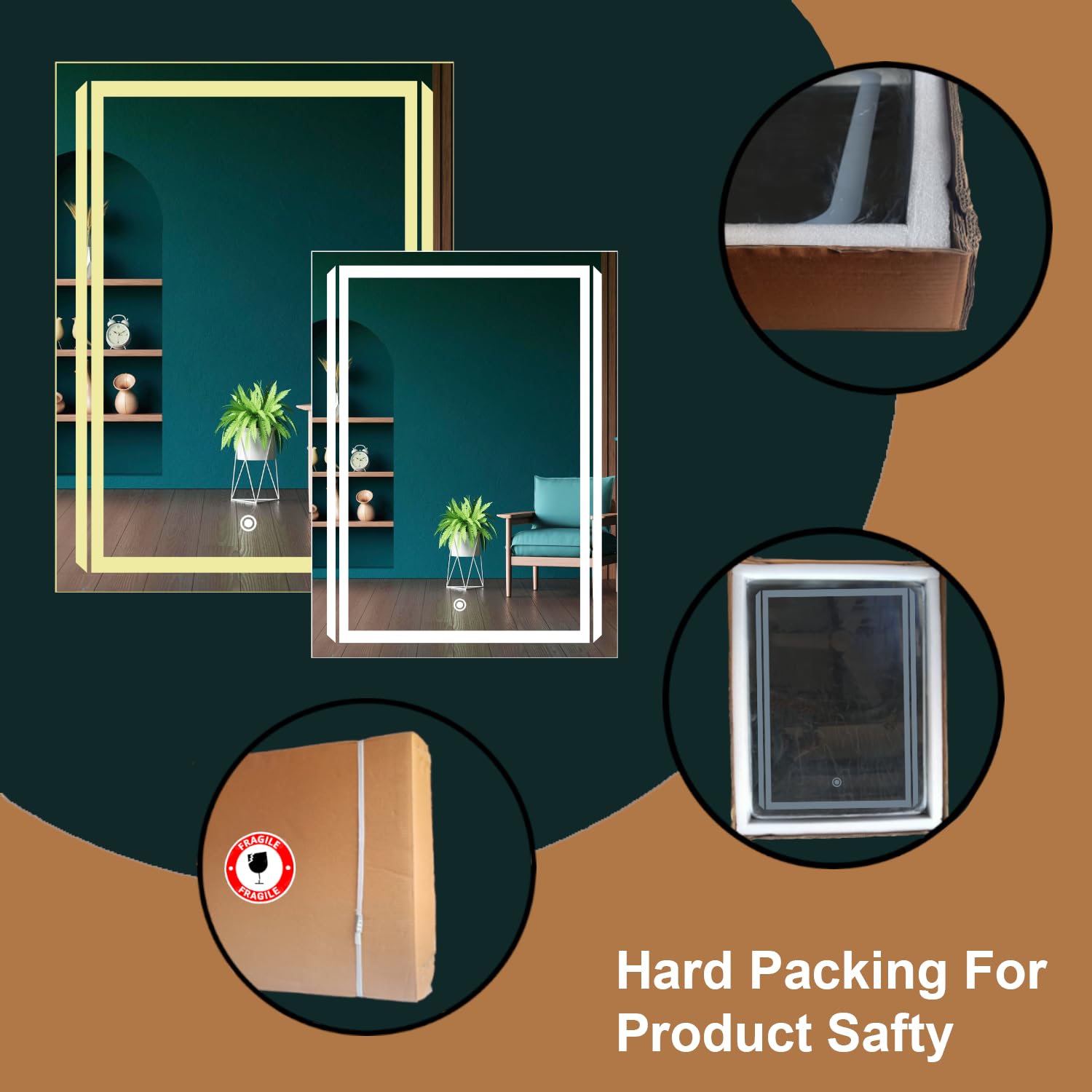 • Strong Packing : Our Sunsyze Mirror packing has passed from multi safety tests like : Heavy weight, Drop test and High Pressure, the package will be receive to you 100% Safely. Please do not accept the order if the packet size is smaller than 21x27x4″ inches (55x70x11 cm).
